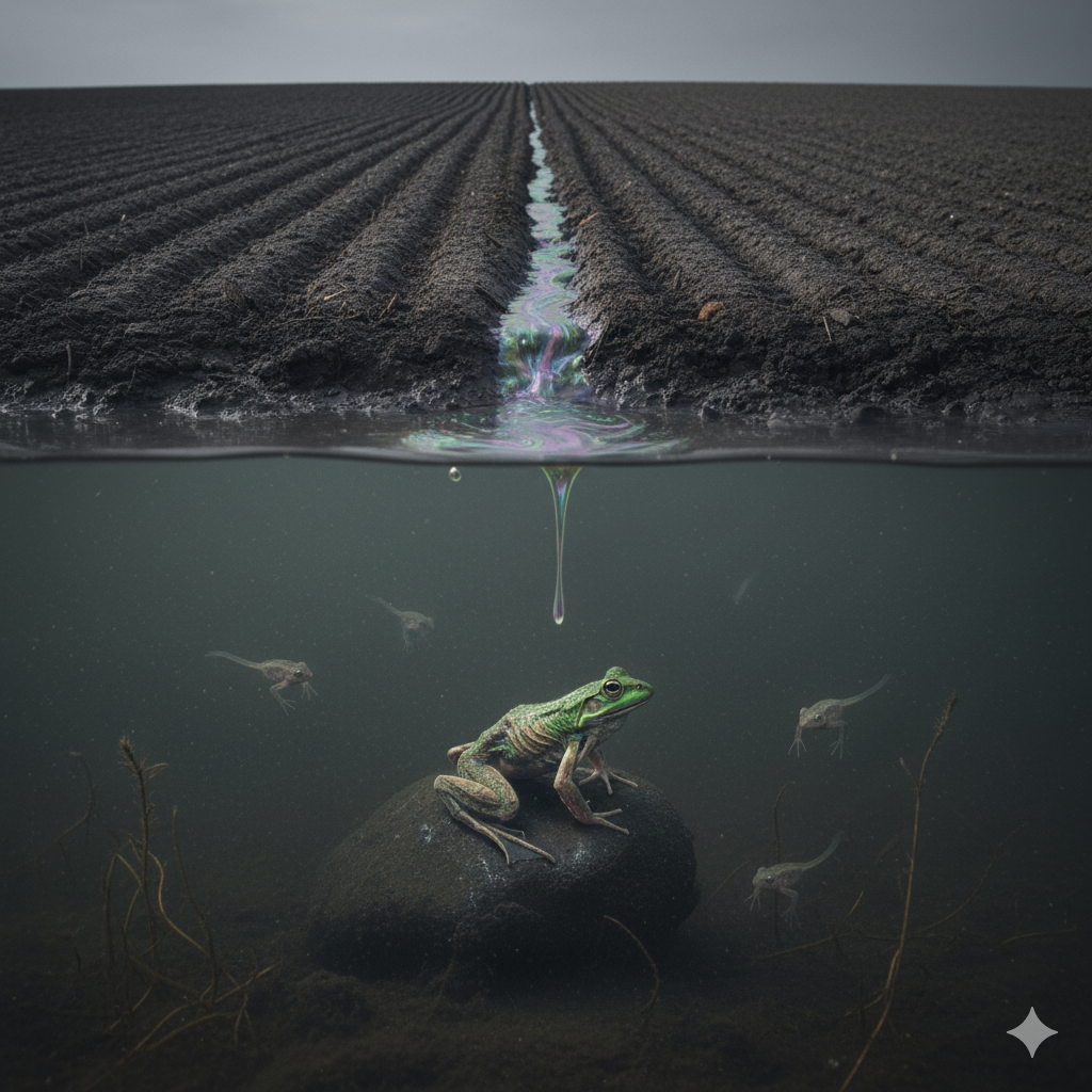 Genau diese Lebensräume werden durch die intensive Landwirtschaft systematisch vergiftet. Pestizide gelangen durch Abschwemmung von den Feldern, durch Drainagen oder durch Abdrift bei der Ausbringung in die Laichgewässer der Amphibien. Die Folgen sind fatal. Aktuelle Studien zeigen, dass Neonicotinoid-Insektizide die Embryonalentwicklung von Fröschen massiv stören und zu erheblich verkleinerten Augen sowie missgebildeten Nerven- und Herzstrukturen führen können. Das Herbizid Atrazin, obwohl in der EU mittlerweile verboten, aber noch immer weltweit im Einsatz, steht im Verdacht, bei männlichen Fröschen zu einer Verweiblichung zu führen, indem es die Hormonproduktion stört. Die Tümpel und Teiche in der Agrarlandschaft werden so zu Todesfallen.