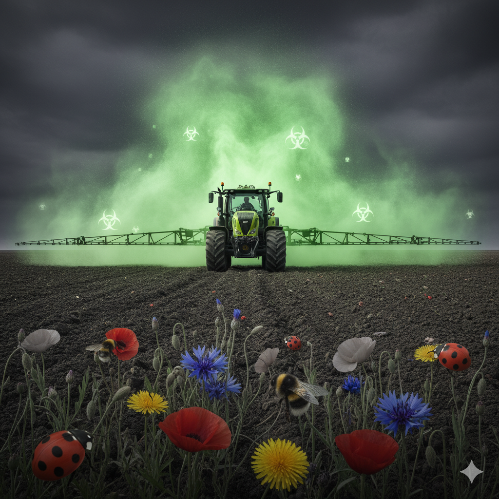 Dieses System führt seinen Vernichtungsfeldzug an zwei Fronten gleichzeitig. Zum einen durch die physische Zerstörung und Entwertung von Lebensräumen. Wälder werden gerodet, Moore trockengelegt und artenreiches Grünland in Ackerland umgebrochen: die Umwandlung der Natur in Produktionsflächen. Gleichzeitig werden diese Agrarlandschaften durch die Beseitigung bisheriger natürlicher Strukturen wie Hecken, Feldraine oder Brachflächen ökologisch entwertet und in lebensfeindliche Wüsten verwandelt. Doch die vielleicht direkteste und brutalste Form des Angriffs ist der chemisch Krieg gegen das Leben selbst. Es ist ein Krieg, der mit hochwirksamen Giften geführt wird, die tagtäglich und flächendeckend ausgebracht werden.