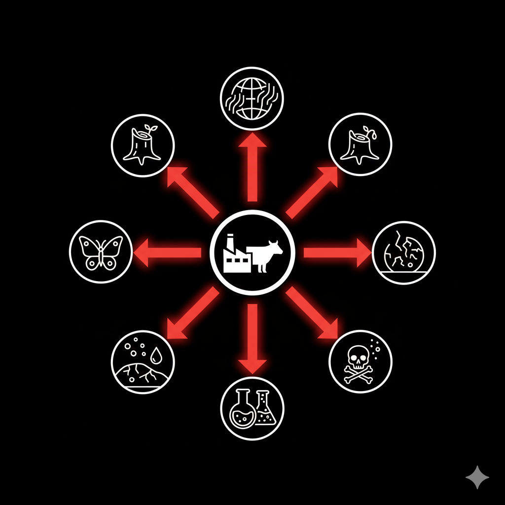 Um die tiefgreifenden Auswirkungen auf unseren Planeten zu verstehen, müssen wir dieses System als das betrachten, was es ist: ein einziges, untrennbar integriertes System. Die pestizid-intensive Landwirtschaft für den Futteranbau existiert in diesem Ausmaß nur, weil es die industrielle Tierhaltung (”Tierfabriken”) als massiven Abnehmer gibt. Umgekehrt können die Tierfabriken nur existieren, weil die intensive Landwirtschaft die benötigten riesigen Mengen an billigem Futter bereitstellt.