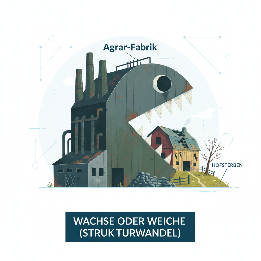 • Das “Wachse oder weiche”-Prinzip: Die Zahl der Betriebe in Deutschland fiel von 396.581 (2005) auf 255.010 (2023). Die Durchschnittsgröße stieg im Gegenzug auf 65 Hektar. Eine Prognose erwartet nur noch 100.000 Höfe bis 2040.