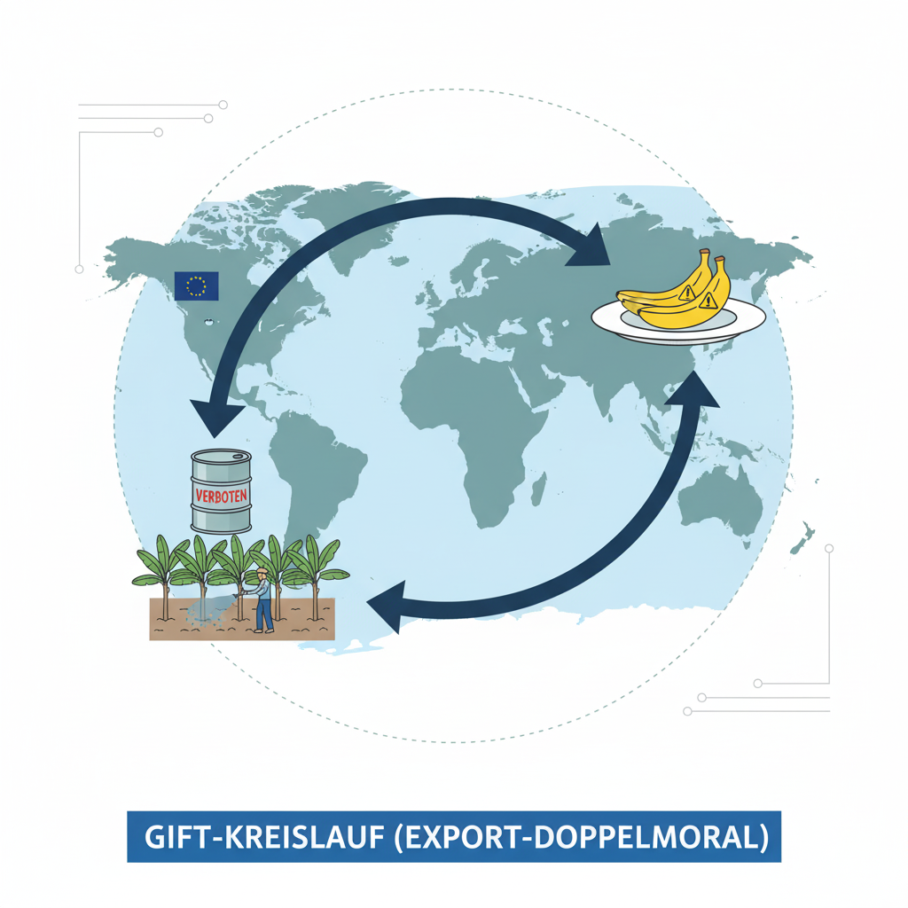 Das Import-Problem: Hohe Überschreitungsquoten findet man auch bei exotischen Früchten aus Nicht-EU-Ländern. Hier schließt sich der “Gift-Kreislauf”: Wir verbieten einen Stoff in der EU, exportieren ihn und konsumieren ihn danach als Rückstand auf importierten Lebensmitteln.