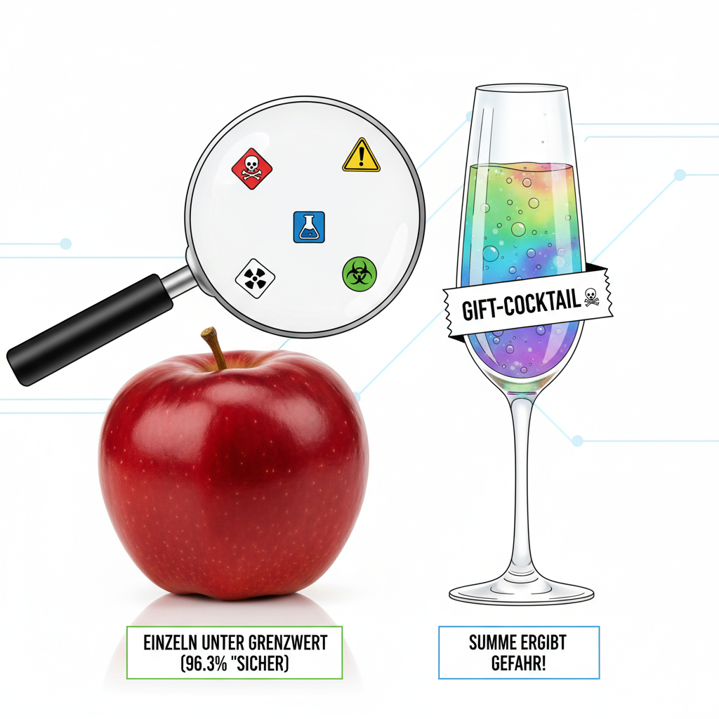 Die Cocktail-Lüge: Die “sicheren” 96,3 % beziehen sich ausschließlich auf die Grenzwerte für Einzelstoffe. Der “tägliche Gift-Cocktail auf dem Teller” wird nicht gemessen. Der deutsche BVL-Bericht 2023 stellt trocken fest: 33,5 % (ein Drittel) aller Proben enthielten Mehrfachrückstände – also mehr als einen Wirkstoff. Ob die Kombination von fünf “sicheren” Einzelstoffen in einer Traube vielleicht doch gefährlich ist, wird schlichtweg ignoriert.