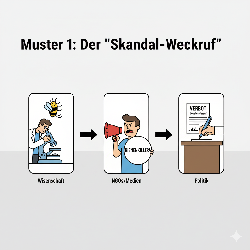 Analyse: Dieses Muster funktioniert, aber es ist tragisch ineffizient. Es erfordert immer ein sichtbares Opfer (die Biene, das Kind). Abstrakte Gefahren (wie der langsame Verlust der Bodenfruchtbarkeit) oder die “Cocktail-Effekte” erzeugen selten einen solchen Skandal – und werden daher seit Jahrzehnten ignoriert.
