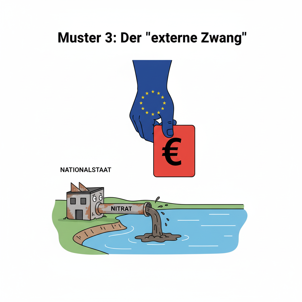 - Die Umsetzung: Die nationale Regierung setzt die Reform (z. B. die Düngeverordnung) über Nacht und gegen den Willen ihrer eigenen Klientel um.