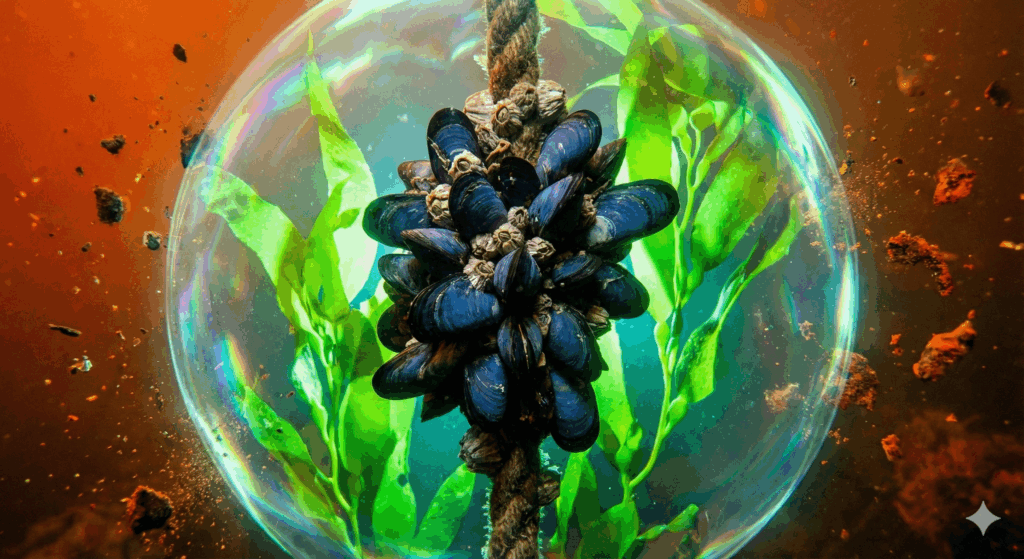 Antwort: Würden wir Muscheln in Monokultur züchten, hätten wir tatsächlich in 20 Jahren ein massives Problem. Aber genau deshalb propagieren viele Experten ein integriertes System. Dabei kommt der „Halo-Effekt“ ins Spiel: Die Algen(der Kelp), die wir direkt neben den Muscheln züchten, sind CO2-Staubsauger. Sie entziehen dem Wasser im direkten Umkreis so viel Kohlendioxid, dass der pH-Wert lokal steigt und das Wasser wieder basischer wird. Der Kelp spannt einen chemischen Schutzschirm über die Muscheln. Ohne Algen keine Muscheln – das ist die neue Regel.