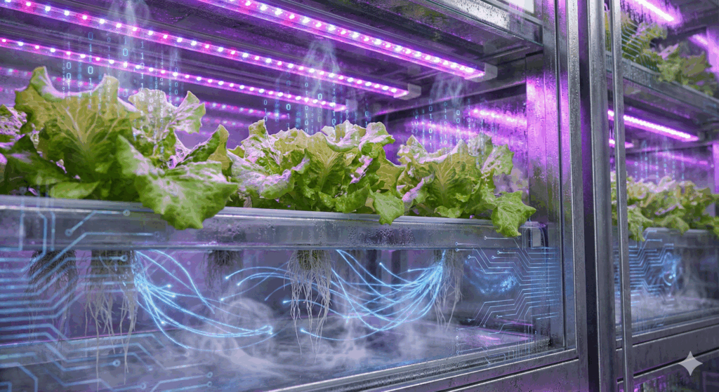 Der erste Fluchtweg führt nach oben. In den Metropolen der Welt, von Singapur bis New York, wachsen Salate, Kräuter und Beeren nicht mehr unter der Sonne, sondern in geschlossenen Hallen, gestapelt in Regale, beleuchtet von violett schimmernden LEDs.