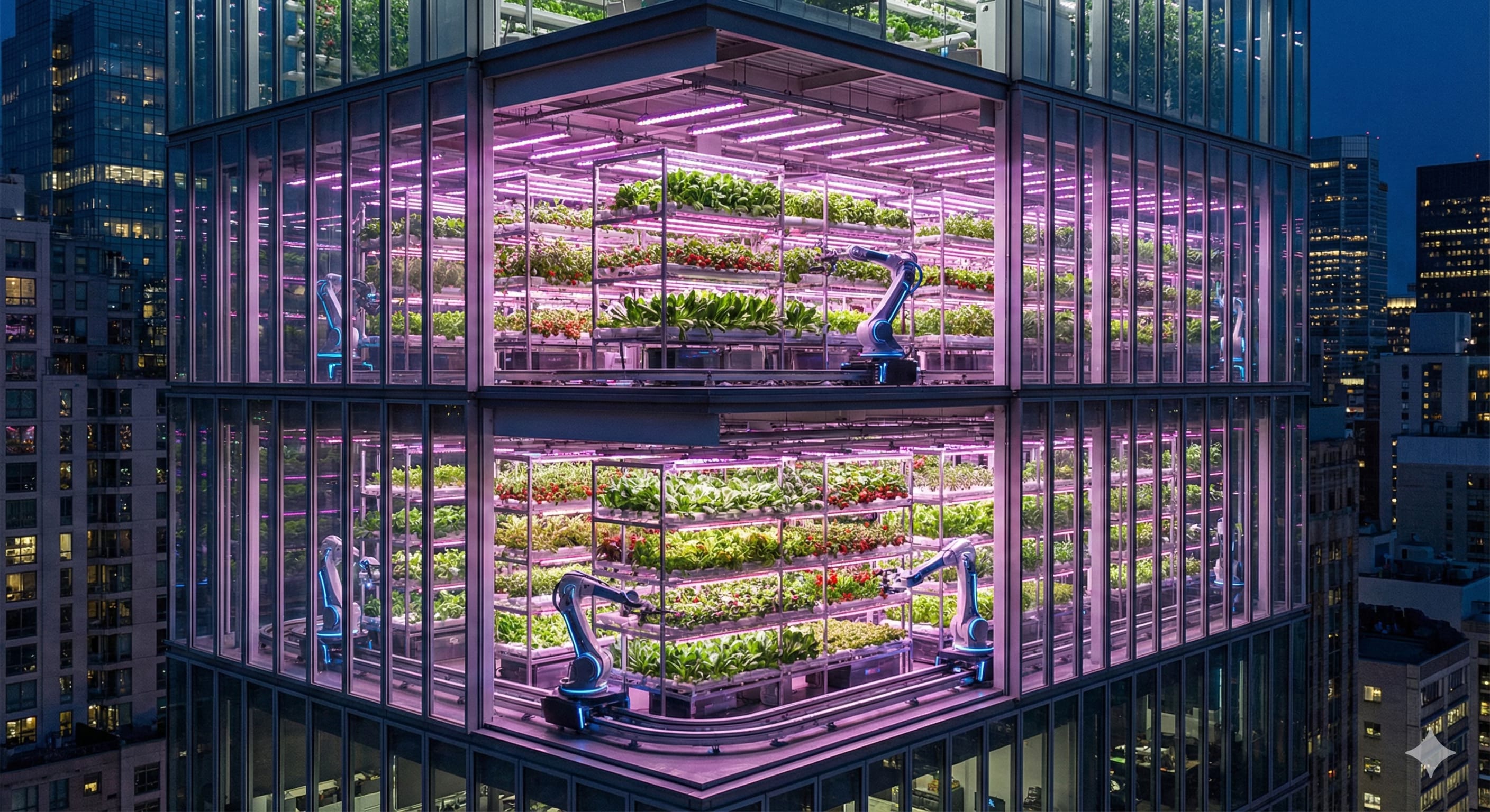 - Vertical Farming (Urbane Produktion): Wir verlagern die Produktion von Salaten, Kräutern und Beeren in die Höhe. In geschlossenen Klimakammern wachsen Vitamine pestizidfrei und wassersparend direkt in der Stadt, was Transportwege und Ackerfläche spart.