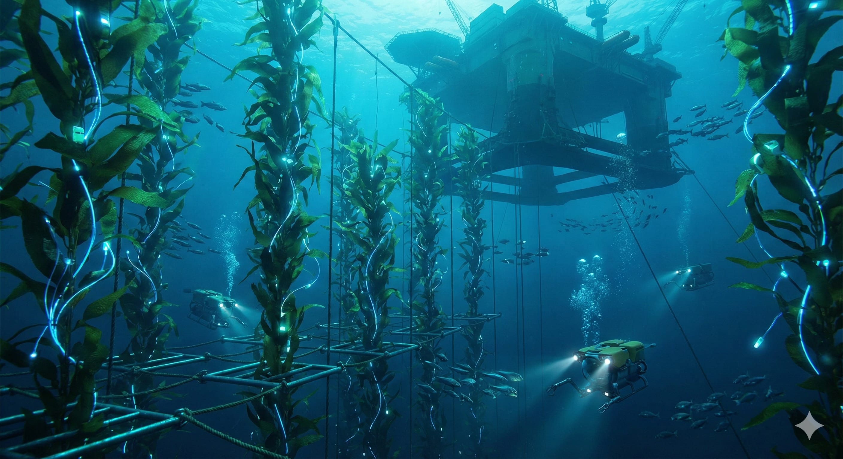 - Die Blaue Revolution (Marine Permakultur): Dies ist der schlafende Riese. Wir nutzen die Ozeane nicht mehr als Jagdrevier, sondern als dreidimensionalen Garten. Algenfarmen in Offshore-Anlagen brauchen kein Süßwasser, keinen Dünger und kein Land. Sie sind biotechnologische Hochleistungsmaschinen, die CO₂ binden und Wasser reinigen.