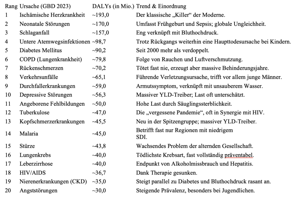 Interessanterweise fehlen in diesen Top 20 jene Gefahren, vor denen wir uns am meisten fürchten: Mord, Terror und Gewalt. Selbst die rund 720.000 Suizide und 458.000 Morde jährlich, die ich im vorigen Artikel erwähnt habe, verursachen in der globalen DALY-Rechnung weniger Leid als beispielsweise Rückenschmerzen oder Kopfschmerzerkrankungen. Dies unterstreicht die Notwendigkeit, unseren Blick von den spektakulären Ereignissen auf die schleichenden, systemischen Katastrophen zu lenken.