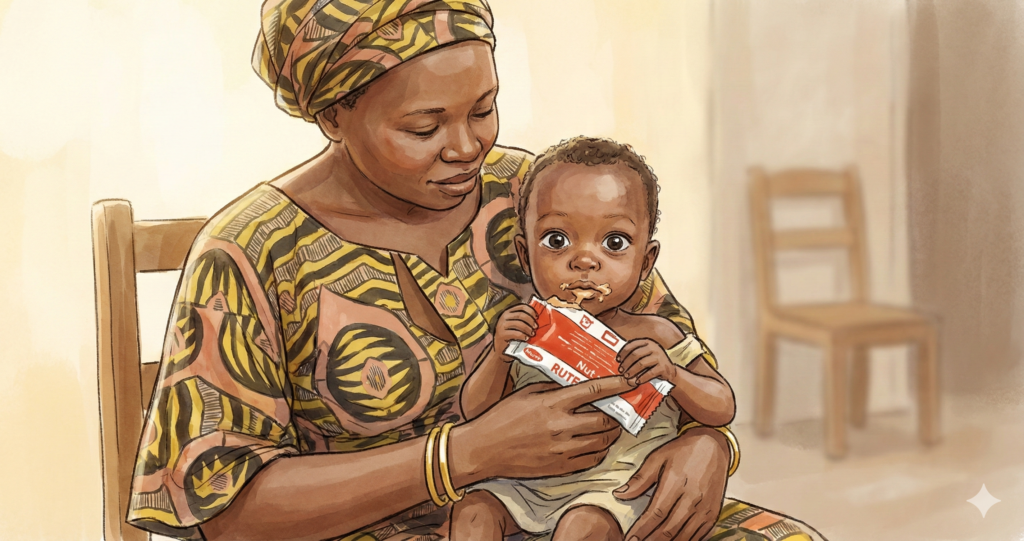 Mütter können ihre sterbenden Kinder nun zu Hause behandeln. Ein Kind, das nur noch aus Haut und Knochen besteht („Wasting“), kann mit zwei bis drei Beuteln am Tag innerhalb von drei bis vier Wochen wieder auf die Beine kommen.
